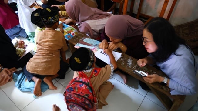 Di dalam ruangan, tersusun rak-rak buku bergambar, permainan edukatif, serta sejumlah relawan yang mendampingi mereka belajar dengan cara menyenangkan.