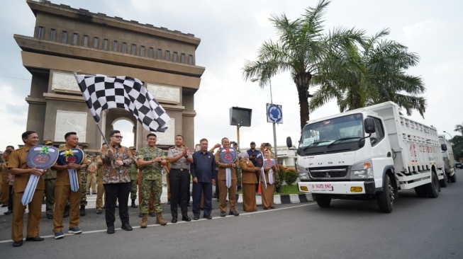 Kendaraan operasional berupa truk roda 6 bagi 36 KDKMP di Kabupaten Kediri diserahkan secara simbolis oleh Bupati Kediri Hanindhito Himawan Pramana beserta Forkopimda di Kawasan Monumen Simpang Lima Gumul.